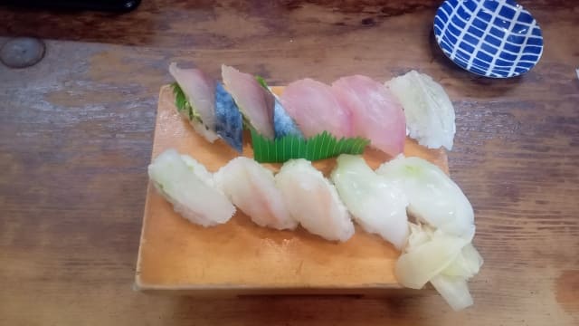 "text": "当日のホワイトボードに書かれた種類から好みの5種類を選べます(各2貫ずつ計10貫、1,200円)。マグロ・ブリ・甘エビ・カニ・焼穴子・イカ・タコなどが登場します。"