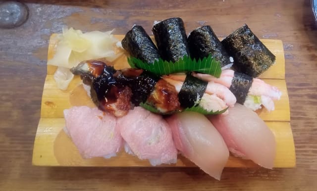 セットの内容は中トロ・ブリ・うなぎ・カニ・キュウリ巻き・みそ汁。